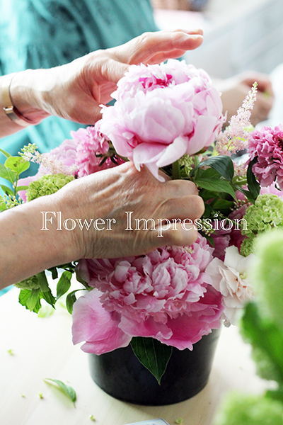 芍薬は一輪ごとに咲き方も表情も違うため、どこにどの子を置くか、皆さんじっくりとお花と対話しながら丁寧にアレンジに集中されていました。