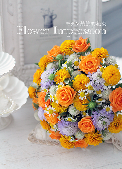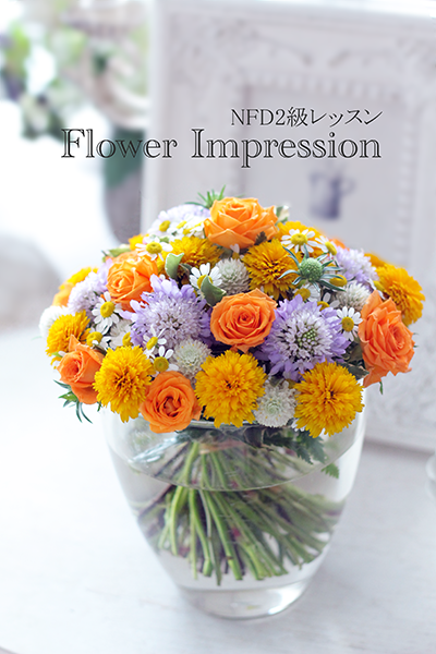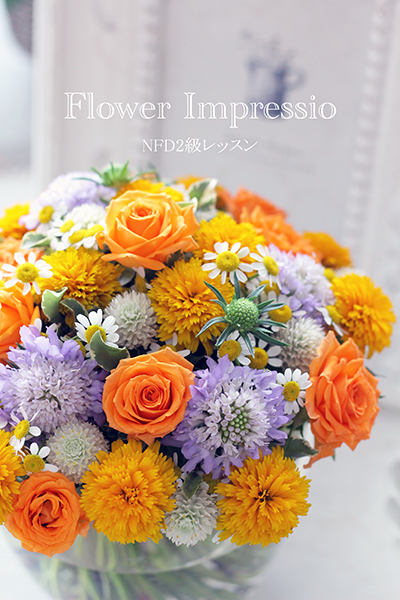 NFD2級レッスン♡モダン装飾的花束♪オレンジ色もたまにはいいですね!