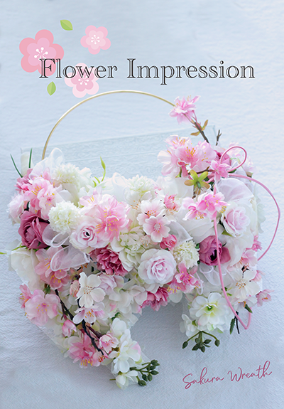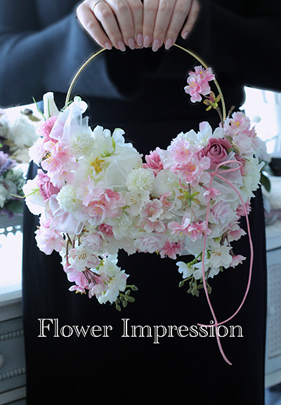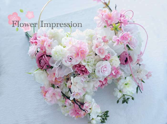 ピンクや白の優しい桜を重ねながら作るリースは、自然とふんわりハート型に仕上がる可愛らしいデザインです。