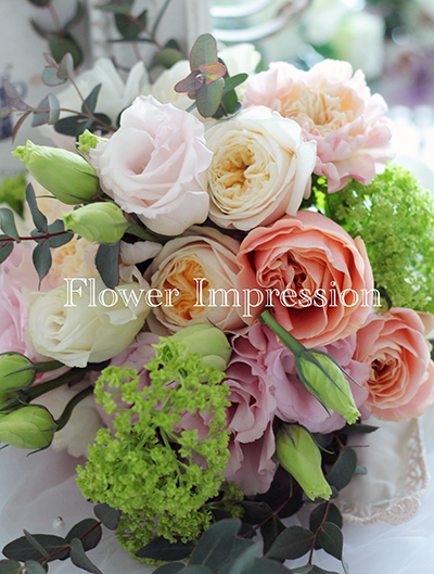 今回のブーケは、アプリコットとピンクを合わせた、甘くやさしい色合いをご用意致しました。