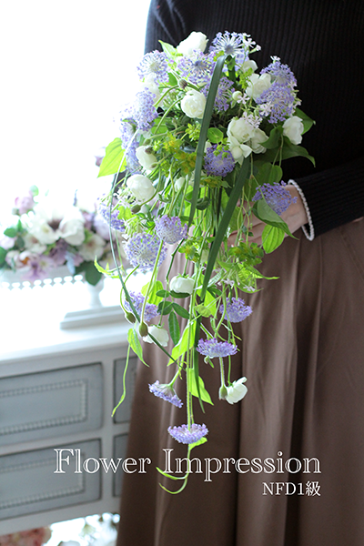 NFD1級のレッスンで生徒様が制作された、優雅な「流れるブーケ」の作品です。