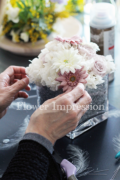 仕上がった作品は、透明感の中に、ふんわりとした可愛らしさが溶け込んだ、とても素敵なアレンジに。